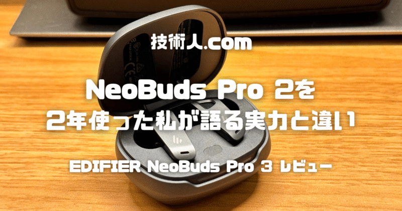 こんにちは、きつね(@gijutsujin)です。 今回は、SOUNDPEATS Clip1をレビューします。 本記事はSOUNDPEATS様より、Clip1をレビュー用にご提供していただきました。SOUNDPEATS様、ありがとうございました! オープンイヤー型イヤホンの定番「Go Free2」を... ガジェットEdifier NeoBuds Pro 3レビュー|NeoBuds Pro 2を2年使った私が語る実力と違い