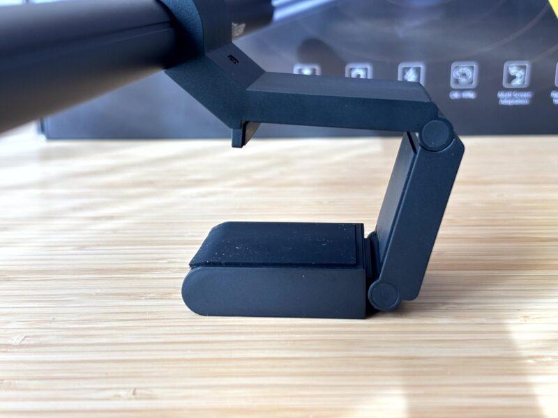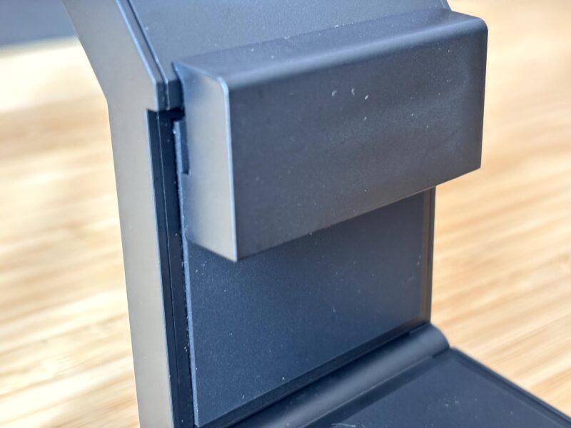 特徴的なヒンジのデザイン。この形状のおかげでどのモニターにもしっかり固定する事が出来る。
