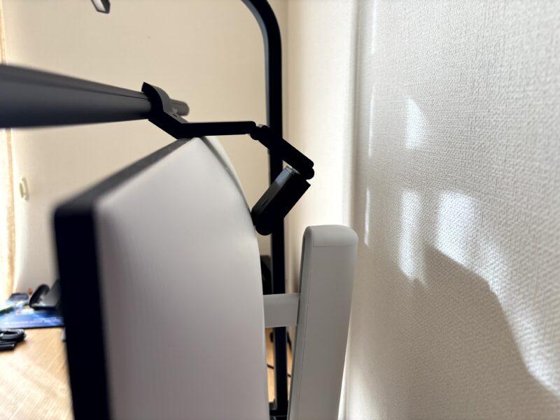 設置はモニター上部に引っ掛けるだけで、工具も不要。クランプ部分の安定感も高く、外れる心配はほとんどありません。