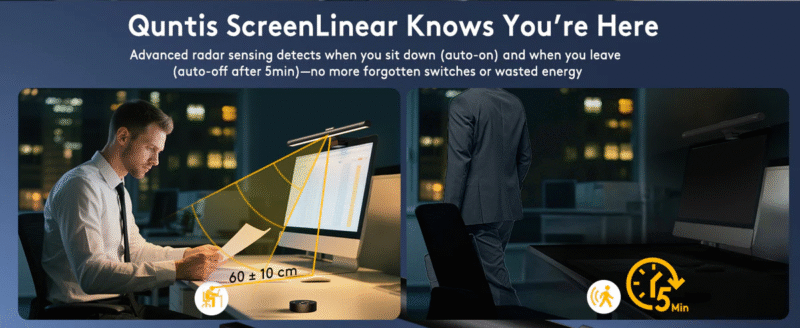 Quntis ScreenLiner Radar Pro+ は 人感センサー搭載で席を離すと自動消灯、戻ると自動点灯する機能があるのが大きな特徴です。また、価格は Screenbar Halo の約1/3程度と手頃で、コスパ重視の方には非常に魅力的です。