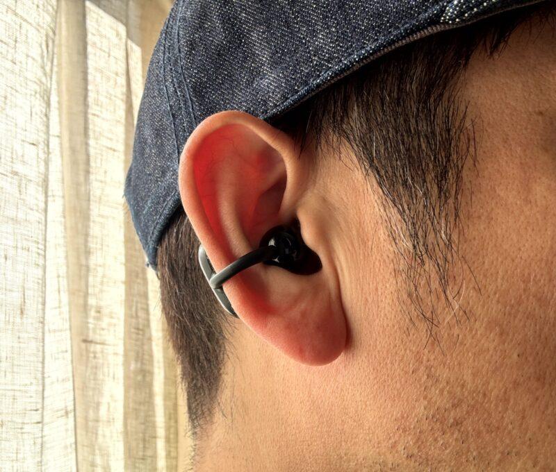 耳に掛けるイヤーカフ型の形状は、スタイリッシュで軽やかな印象を与えるだけでなく、装着時の安定性に大きく寄与しています。特にランニングや筋トレなど、身体が大きく動くシーンではこの構造が本領を発揮。