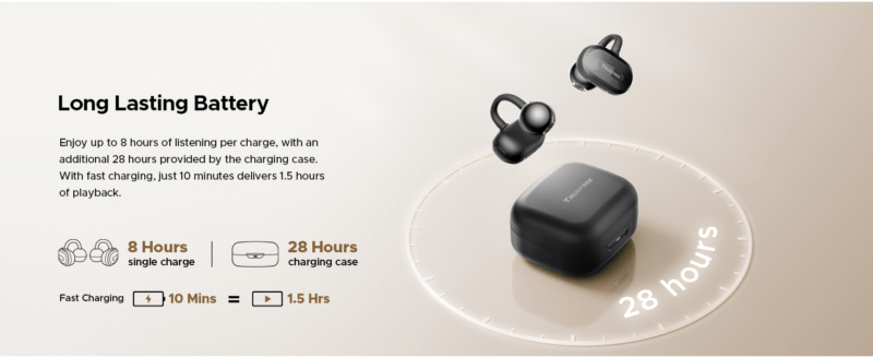 バッテリー性能も頼もしく、イヤホン単体で最大約8時間、ケース併用で合計約28時間の再生が可能。